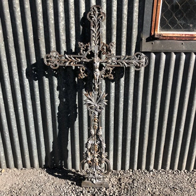 Vintage cast iron French crucifix with intricate and ornate ironwork.