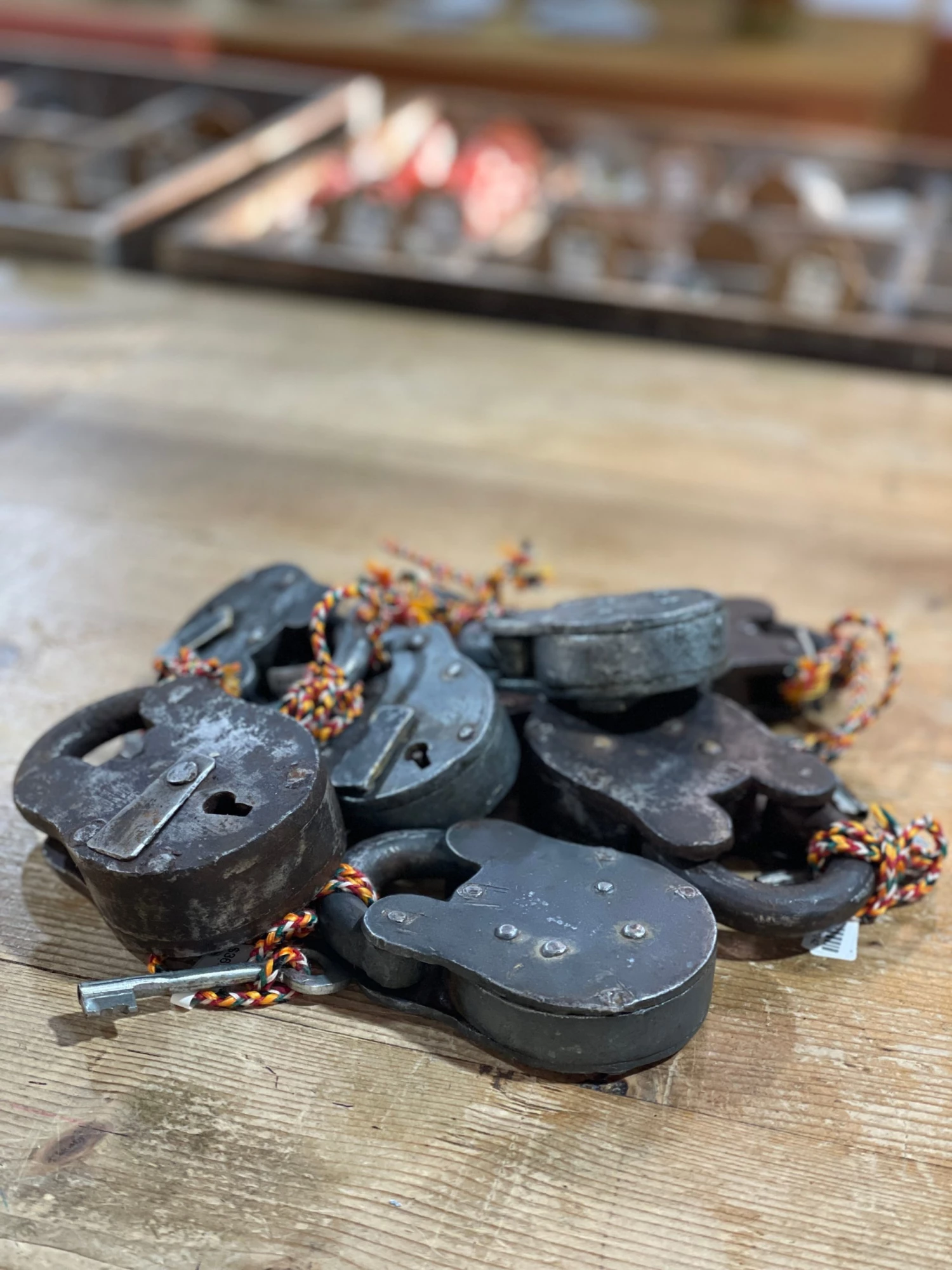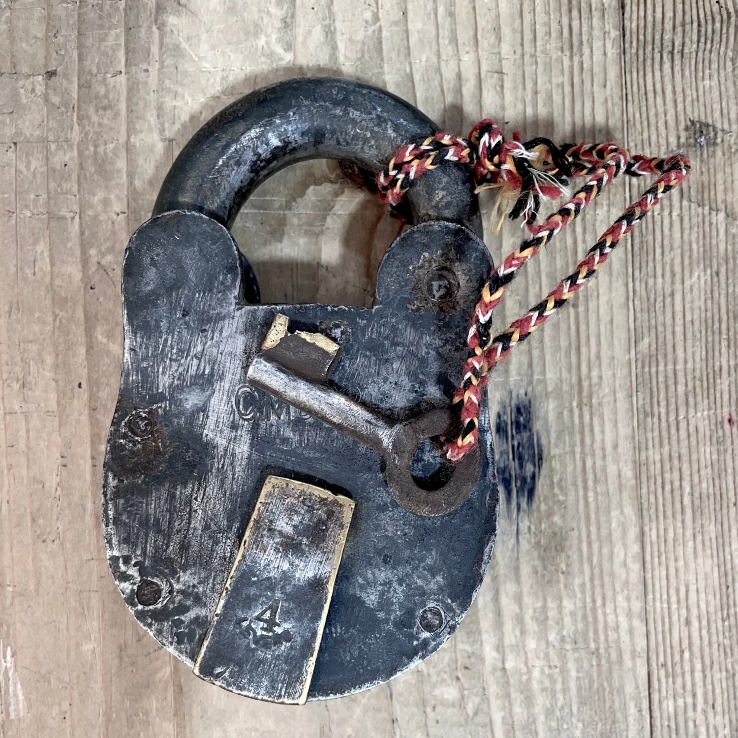 Beautifully weighted and vintage wrought iron trunk chest style box padlock and key.