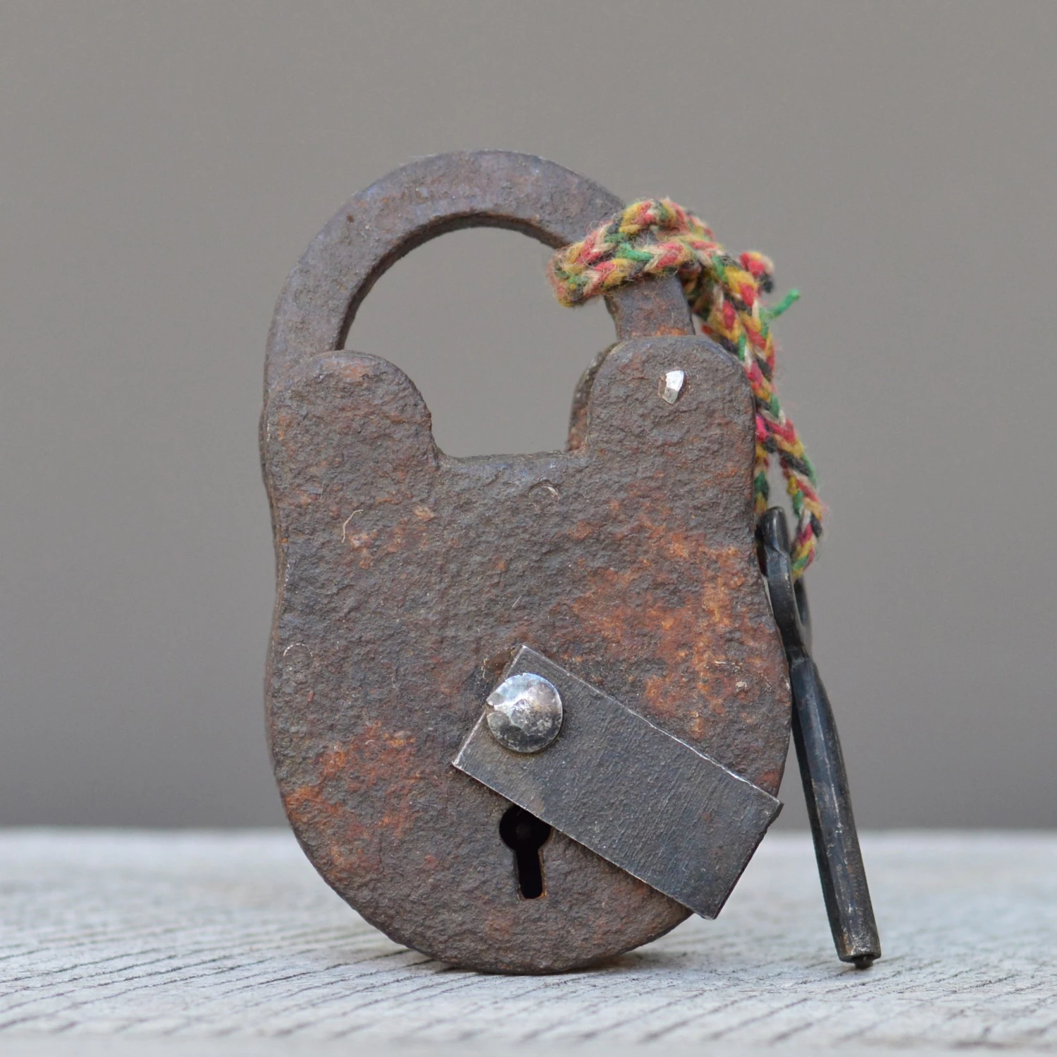 Beautifully weighted and vintage wrought iron trunk chest style box padlock and key.