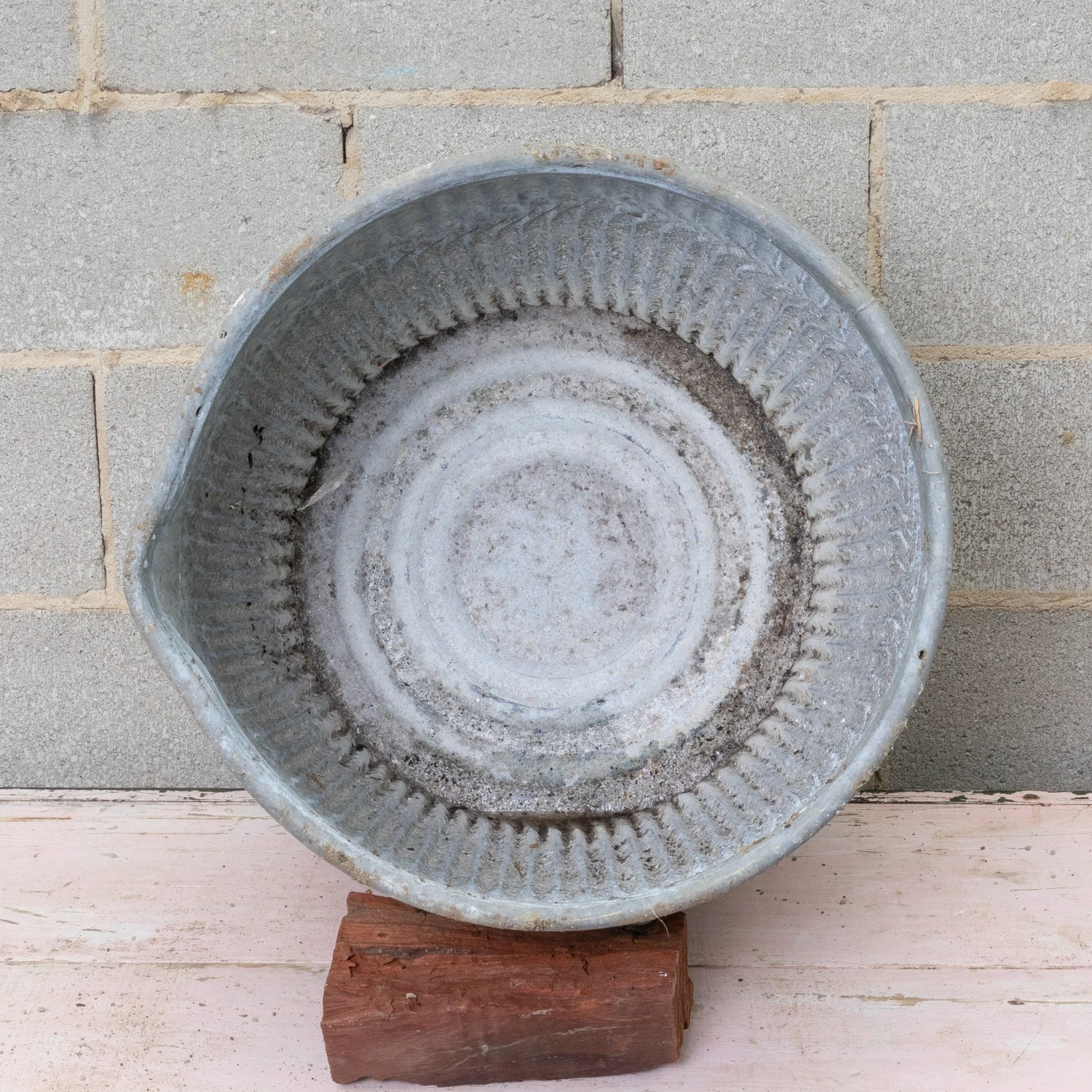 This vintage English Industrial dolly tub is made of galvanized zinc and was originally used for washing clothes, prior to the advent of the washing machine,