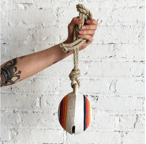 From NYC based MQuan Studio the stoneware dome shaped jingle bell is hand painted with rainbow rings.