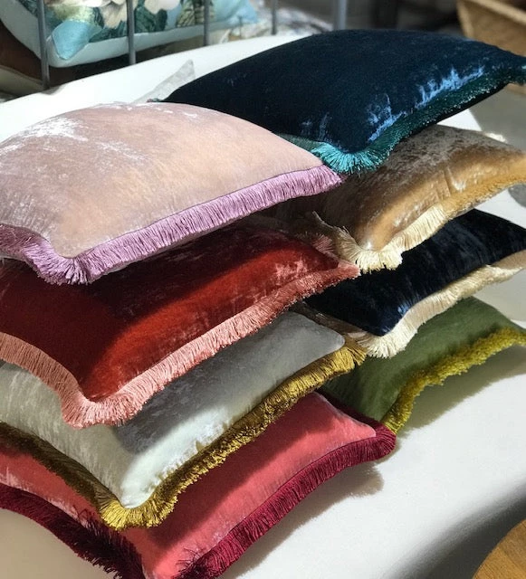 A radiant silk velvet pillow that is hand-dyed in a deep indigo blue hue with a golden fringed trim.