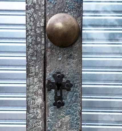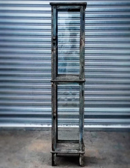 A vintage treasure for all your treasures. This brilliant glazed cabinet, an artifact from another time – originally from an old church in Belgium. Fitted with two removable glass shelves behind two timber doors with crucifix and leaf detailing.