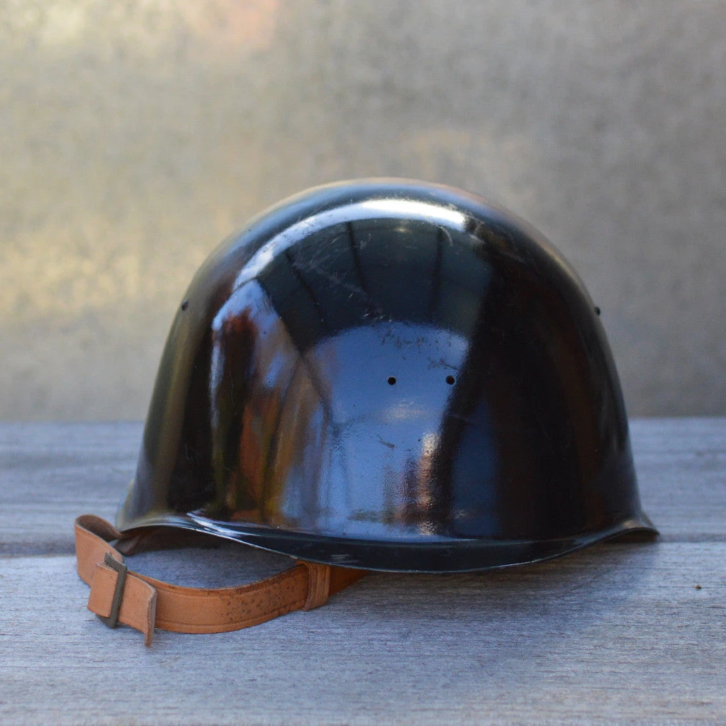 Featuring black painted steel exterior, waxed canvas and felt head hold and leather chin strap.