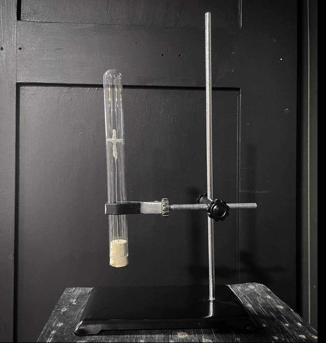 A enchanting and captivating artwork of handmade crystal crucifix, encased in a science lab test tube. On scientific test tube stand. Signed Vox Populi.